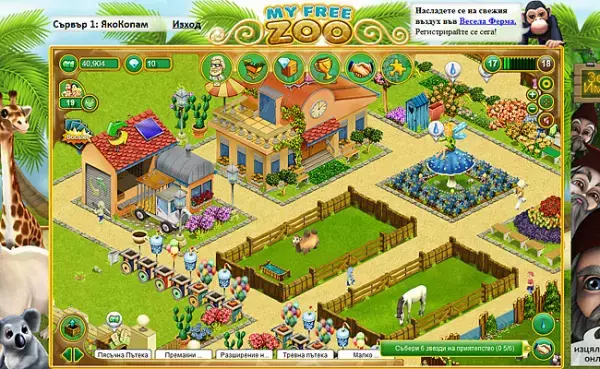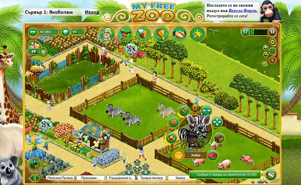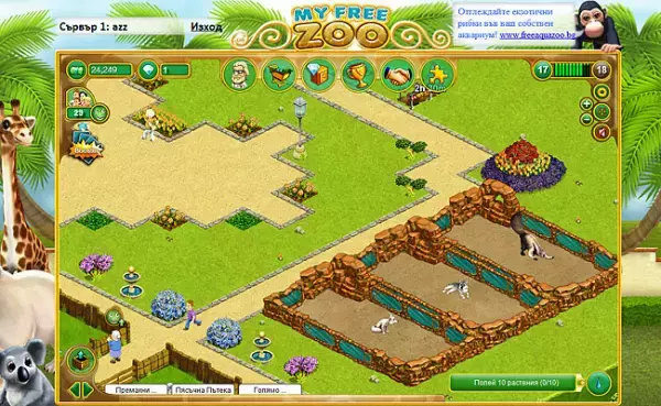 Сладки животни, вълнуващи настройки както и голямо разнообразие от възможности и функции известни сред зоопарк браузър игрите. Изключително впечатляващата браузър игра My Free Zoo ви позволява да отворите свой собствен онлайн зоопарк. Вие ще строите заграждения, ще поставяте пътеки и ще украсявате своя зоопарк в тази браузър игра с цветя, дървета, както и храсти и екзотични животни.